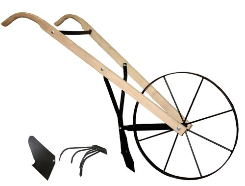 Hi-Wheel Plow 4 1/2 foot wooden handles, 24" steel wheel, turn shovel, cultivator & double point included.